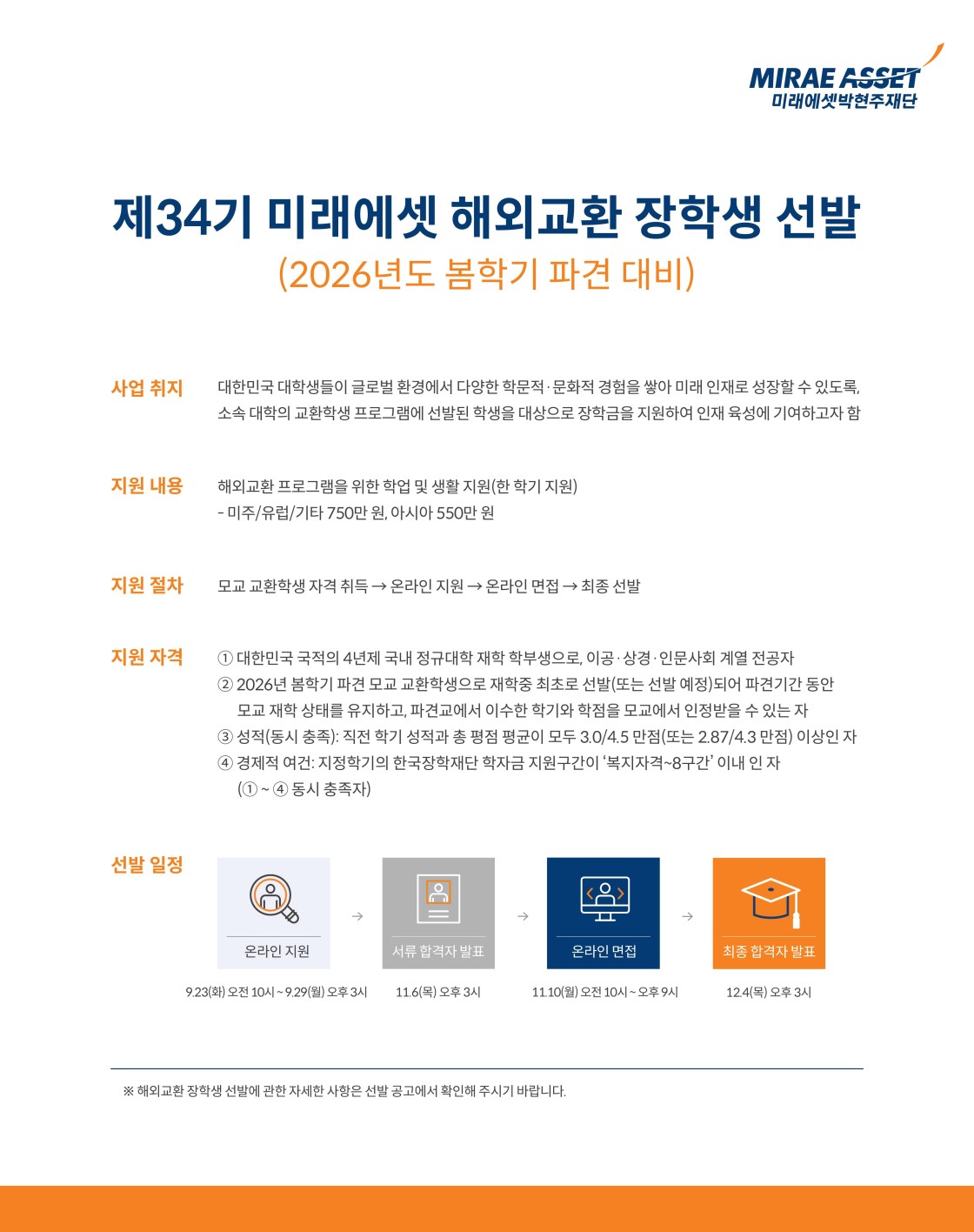 2026년 봄학기 파견 | 제34기 미래에셋 해외교환 장학생 모집(~9/29 오후 3시)