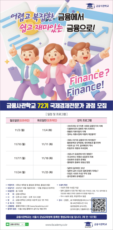 컨텐츠 정보 목록 마감 [금융사관학교] 72기 모집(~10/29) 45 0 본문 금융사관학교 기업형태 중소기업 참여대상 대학생, 직장인/일반인 접수기간 시작일 2025-10-03 마감일 2025-10-29 활동기간 시작일 2025-11-01 마감일 2025-11-30 모집인원 100명명 활동지역 지역 제한없음 우대역량 기타 홈페이지 http://www.facademy.co.kr/ 활동혜택 수료증 및 인증서, 인턴쉽 기회 관심분야 교육 경제/금융 활동분야 강연 추가혜택 취업추천서, 취업특강 공유하기 홈페이지 지원 상세내용 지원서 다운로드 첨부 지원서 파일 없음 담당자 정보 담당자 [금융사관학교] 72기 모집(~10/29) 연락처 이메일 댓글 0 등록된 댓글이 없습니다. 로그인한 회원만 댓글 등록이 가능합니다. 목록