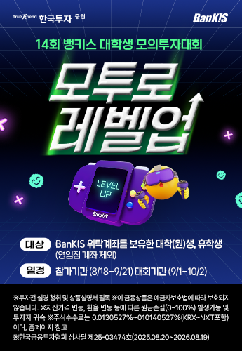 컨텐츠 정보 목록 마감 [한국투자증권]14회 대학생 모의투자 대회 40 0 본문 한국투자증권 기업형태 대기업 참여대상 대학생 시상규모 1,770 만원 접수기간 시작일 2025-08-18 마감일 2025-09-21 홈페이지 https://securities.koreainvestment.com/main/customer/notice/Event.jsp?gubun=i&cmd=TF04gb010002¤tPage=1&num=6371 활동혜택 입사시 가산점, 상장 수여 활동분야 기타 추가혜택 참가고객 모두 랜덤쿠폰 지급 공유하기 홈페이지 지원 상세내용 지원서 다운로드 첨부 지원서 파일 없음 담당자 정보 담당자 한국투자증권 연락처 이메일 댓글 0 등록된 댓글이 없습니다. 로그인한 회원만 댓글 등록이 가능합니다. 목록