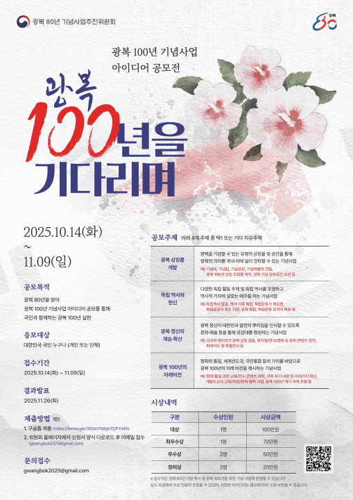 [광복 80년 기념사업추진위원회] 광복 100년 기념사업 아이디어 공모전(~11/09)